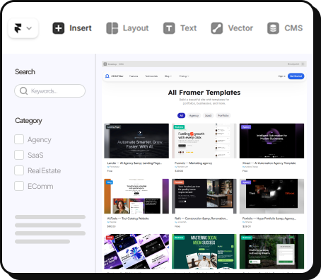 Copy components from dashboard. Paste in Framer. Connect to your CMS Collection slot.